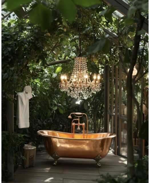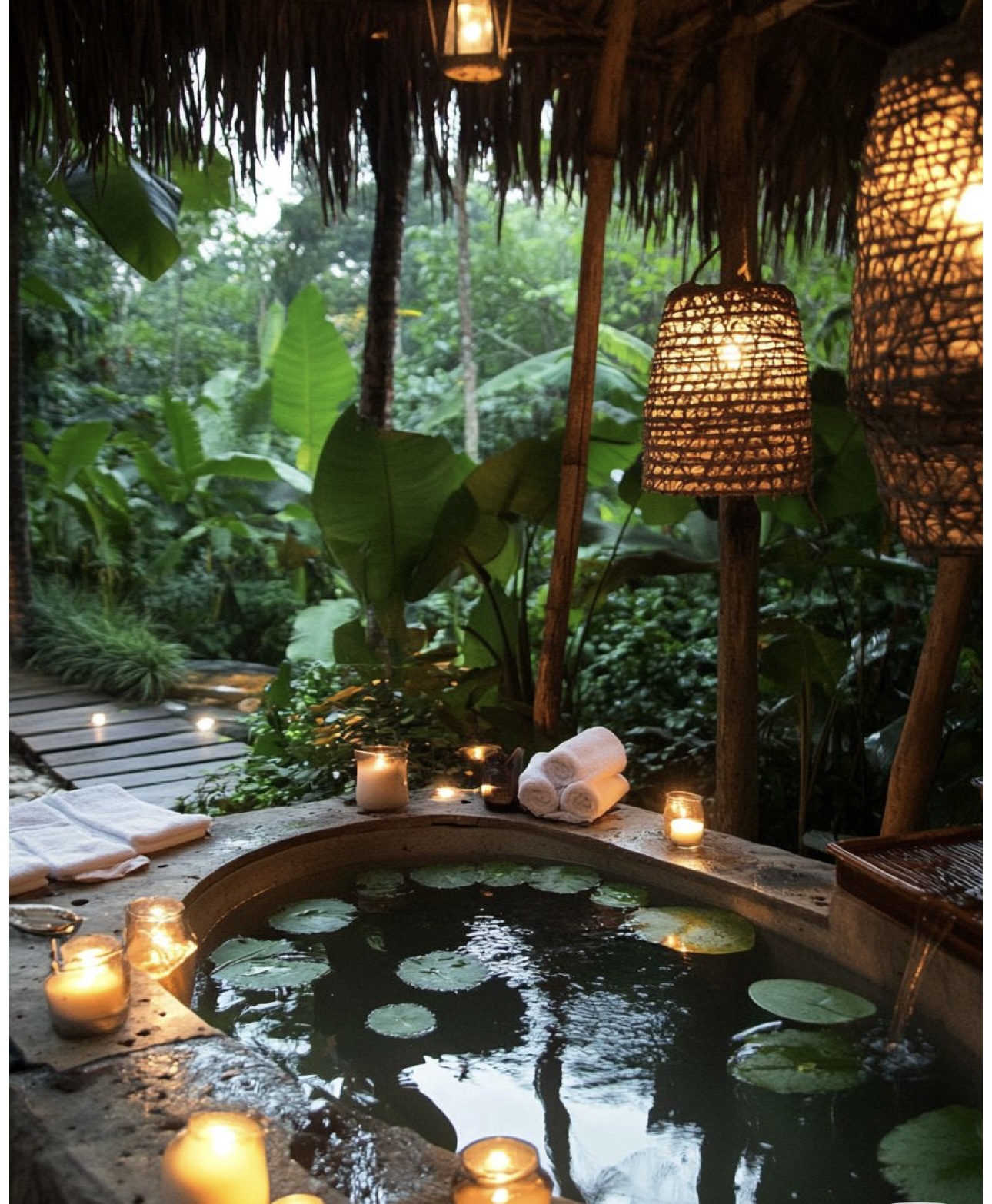 Soak beneath the canopy of trees in our large soak bath with flower essences and champagne.